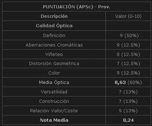 El resultado es muy favorable, prácticamente excelente. En los apartados de calidad de imagen: definición, aberración cromática, distorsión geométrica, y viñeteo, obtiene solo un 8,63 sobre 10, y la nota global baja solo a 8,24 por algún pequeño detalle en la construcción y por ser una focal fija.