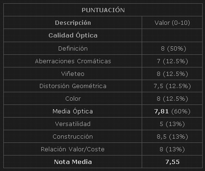La nota global baja un poquito, hasta 7,55, pero simplemente por la baja puntuación en el apartado “versatilidad”. Realmente un zoom extra angular no es un objetivo universal.
