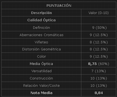 Mirando la tabla de valoración podemos ver que, la nota media en el apartado calidad de imagen es de 8,75 sobre 10, una nota altísima tratándose de un zoom. Los puntos fuertes son de 9 (definición, color, y aberraciones cromáticas), pero es que los debiles son de 8 (distorsión y viñeteo).