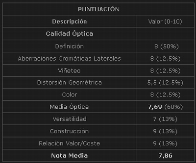 Mirando la tabla de valoración podemos ver que, la nota media en el apartado calidad de imagen es de 7,69 sobre 10, que para ser un zoom es una nota muy buena sin llegar a ser excelente. Lo que si hay que decir en su favor es que es muy equilibrado, pues obtiene un 8 sobre 10 en todo menos en distorsión geométrica donde queda en un aprobado raspado de 5,5 sobre 10.