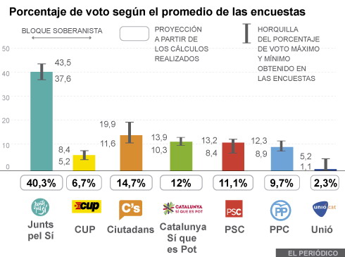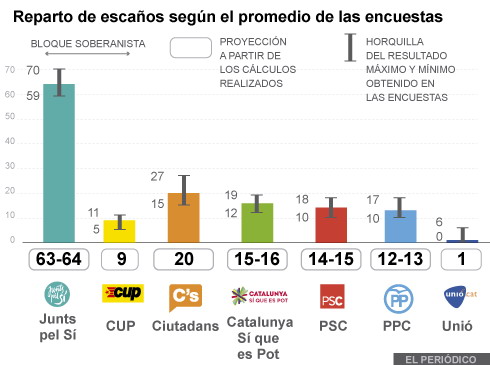 No pretendo abrir ningún debate ni mucho menos ninguna polémica, pero no me puedo sustraer al hartazgo que están suponiendo estos últimos días de campaña con exhibición testosterónica y maliciosa de las armas de más pesado calibre por ambos bandos, si que voy a publicar un par de gráficos interesantes que recopila hoy El Periódico de Catalunya. En ellos se recogen los previstos resultados «en escaños» y «en votos», que no es lo mismo, con la horquilla máxima estimada entre todas las encuestas que un montón de medios han encargado y publicado en estos últimos días.