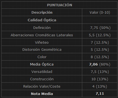 Mirando la tabla de valoración podemos ver que, la nota media en el apartado calidad de imagen es de 7,06 sobre 10, lo que es una nota notable e incluso buena pero queda muy lejos de excelente, soberbia o excepcional. Brillar, lo que se dice brillar, no brilla en nada pues en nitidez alcanza un 7,75 sobre 10, que está muy bien, pero que podría estar mejor. Sin embargo en distorsión geométrica y en aberraciones cromáticas anda un poco bastante flojo.