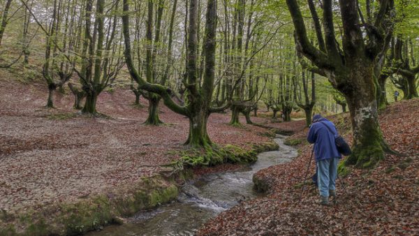 Cuando mi mujer y yo (más yo) llegamos ilusionados al Hayedo de Otzarreta, a pesar de que era un lunes normal fuera de temporada y a primera hora, nos encontramos con una pareja de novios y un fotógrafo que los acompañaba armado con una cámara y un flash con una pantalla de este tipo más grande que cualquiera de las hayas que milagrosamente había por allí. Era otoño, hacía fresco (no frio) y el suelo estaba totalmente embarrado. La novia llevaba botas de montaña que tapaban el largo vestido blanco, pero el novio llevaba unos brillantes zapatos de charol que imagino debió de tirar después de la sesión. Naturalmente intentamos evitarnos y no robarnos plano, pero no pudo ser.